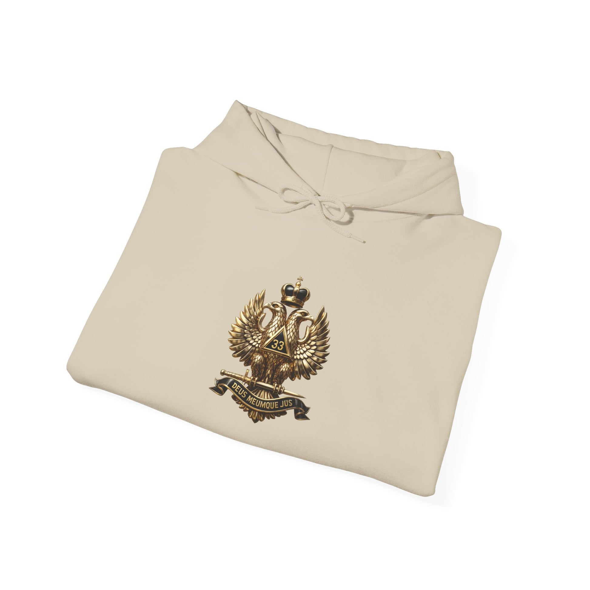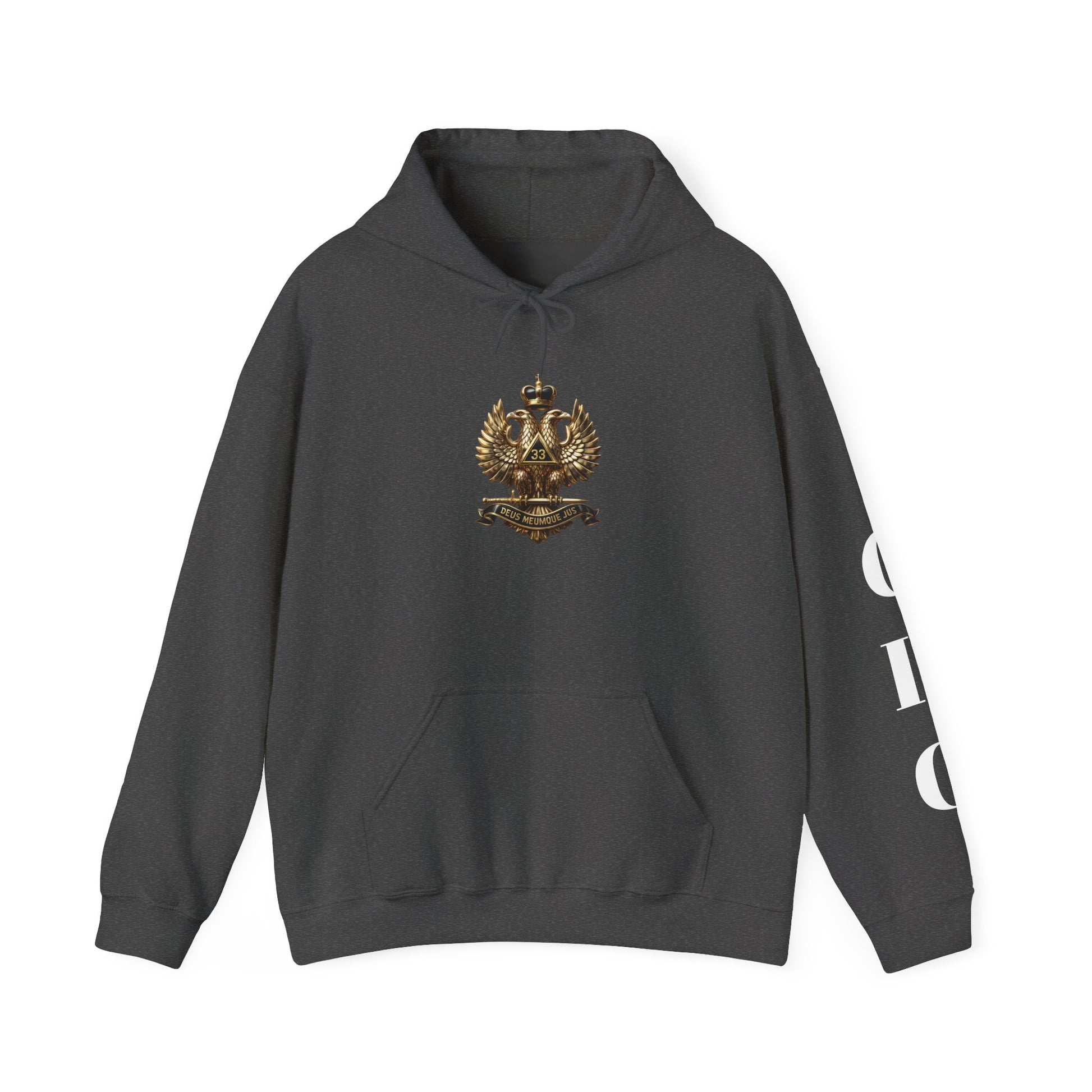 This cozy hooded sweatshirt carries a quiet, vintage-inspired crest at the chest — an antique eagle and crown rendered in warm, weathered tones. It feels like slipping into a familiar library coat: substantial and soft, with a deep pouch pocket for cold hands and a double-lined hood that settles around your neck. The design sits centered and tasteful, bringing a subtle touch of old-world character to everyday wear. Wear it during slow mornings with coffee, on late-night walks, or layered under a coat for classier, lived-in warmth.